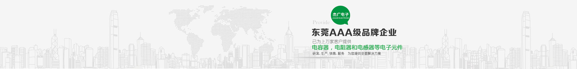 东莞市杰广电子有限公司是一电子元件之专业制造厂 ,销售遍及世界各地,主要产品包括:电容器,电阻器和电感器等电子元件,以供应汽车,通讯,电脑,音响,影像,电动工具,仪表,以及军用电子等工业之电子元件使用。